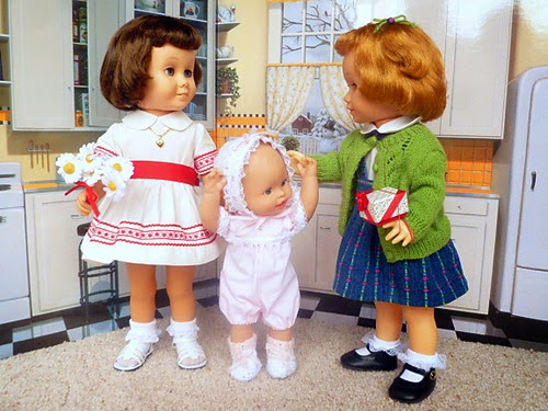 Happy Birthday, Peggy Sue! The “non-18-inch” gang is dressed and ready to attend the party. I stopped them in the kitchen for a photo before they got their coats on. L to R: My childhood Chatty Cathy in a dress my mom made (over 50 years ago!), a modern doll whose outfit was sewn a few years ago by my aunt, and an ebay rescue named Charlene in a jumper I sewed from a thrift store baby romper and another Retro Cardi. It came out too big for the AG girls, but just right for Charlene. Hope all the girls have a wonderful time at the party!